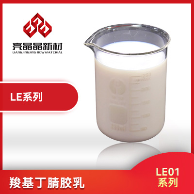 LE01 系列胶乳丁二烯、丙烯腈为主要原料,通过乳液聚合制得的阴离子型热交联型聚合物分散体,可用于生产一次性手套,特别适用于一次性丁腈白板手套,具有优异的延伸率和抗拉强度。